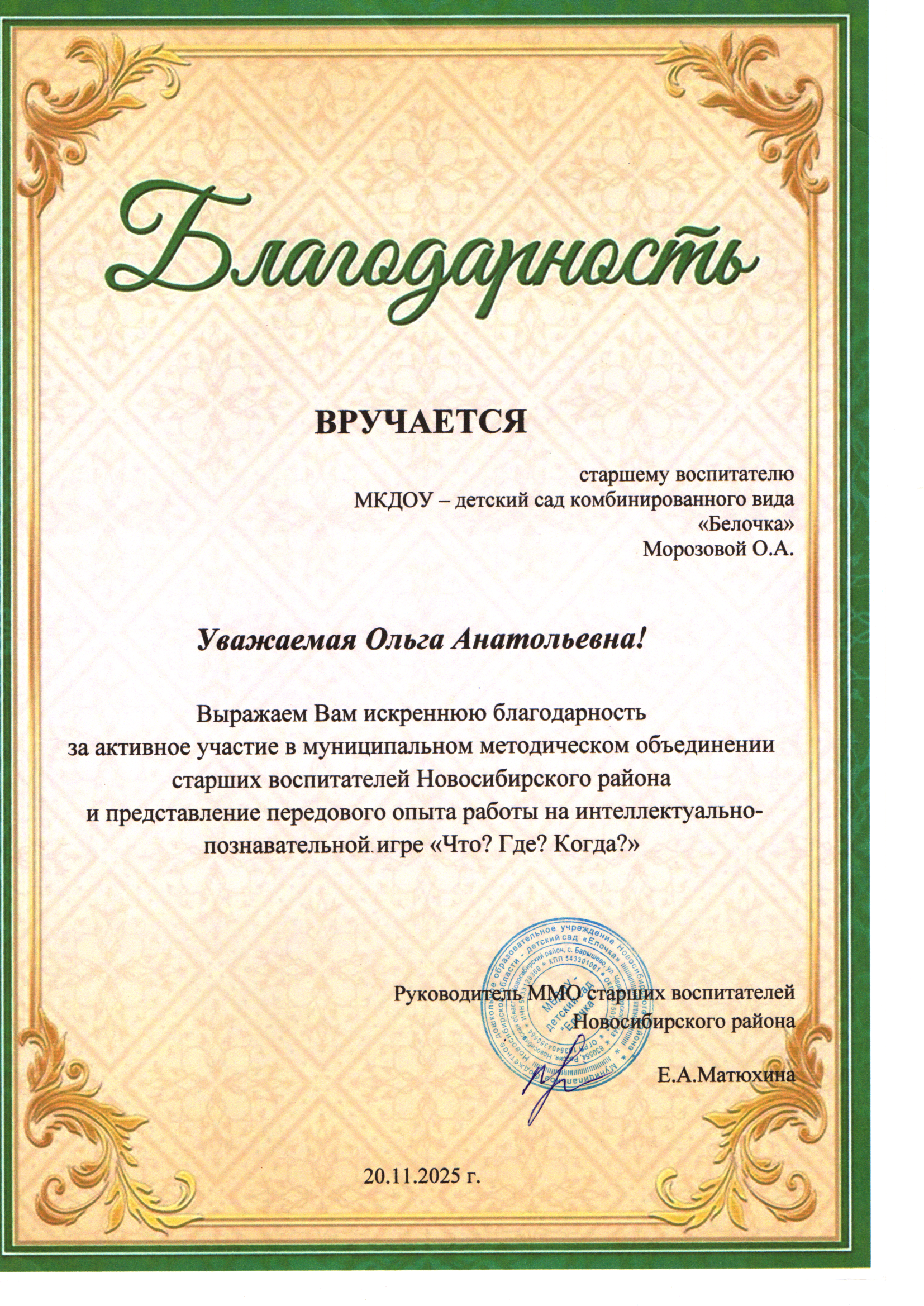 Благодарность участие в ММО старших воспитателей 2025 г.